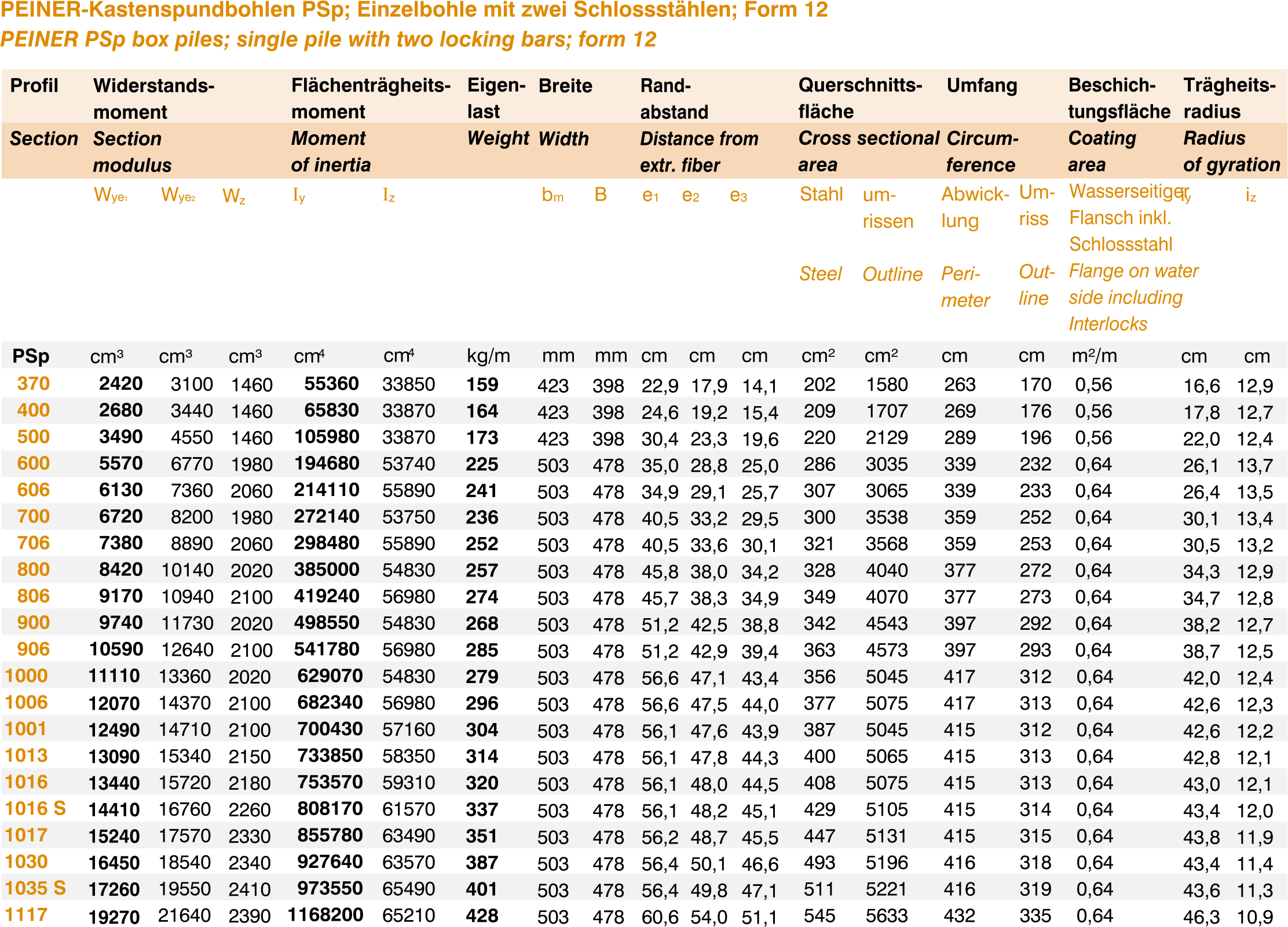 PEINER PSp box piles; single pile with two locking bars; form 12