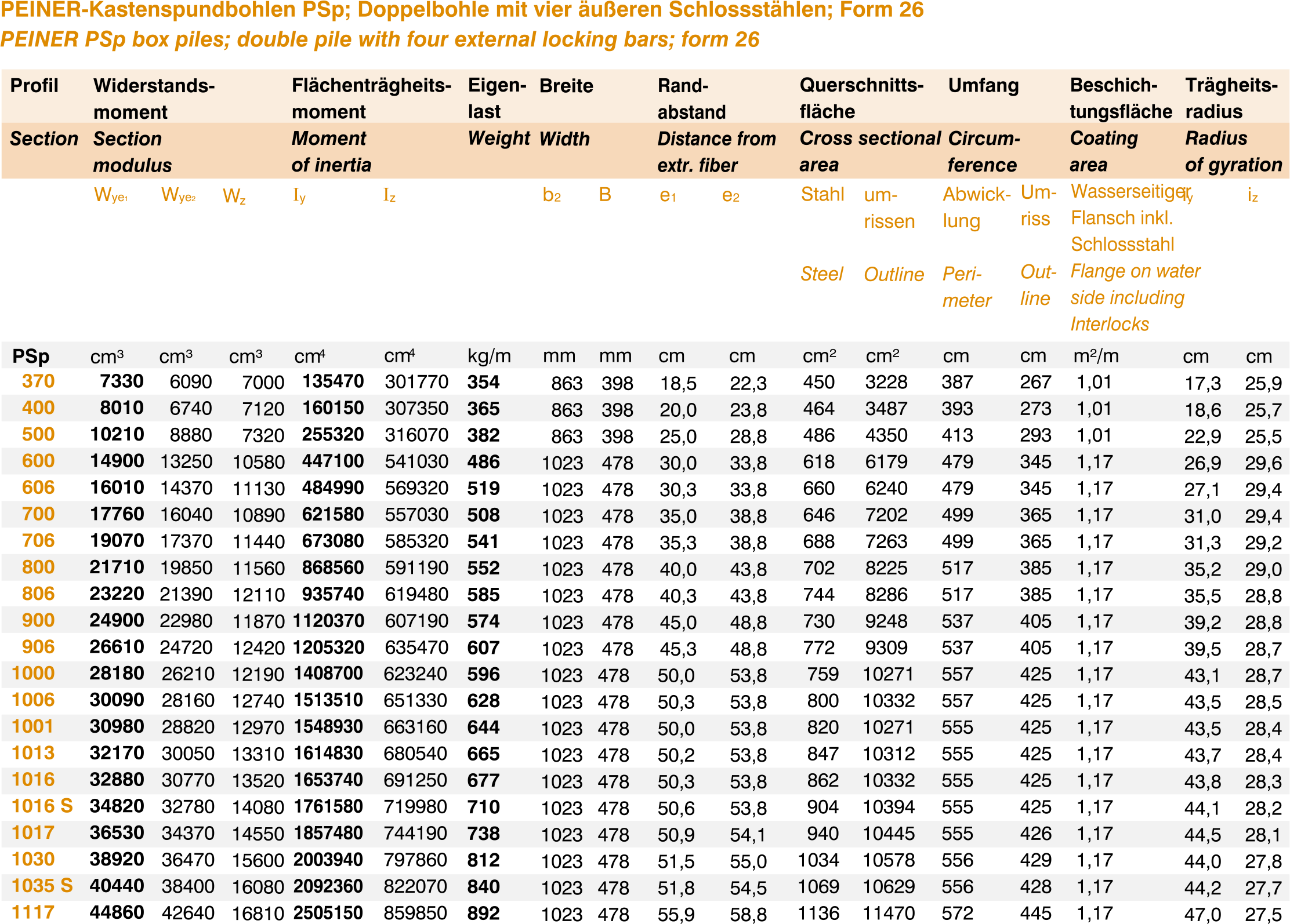 PEINER PSp box piles; double pile with four external locking bars; form 26